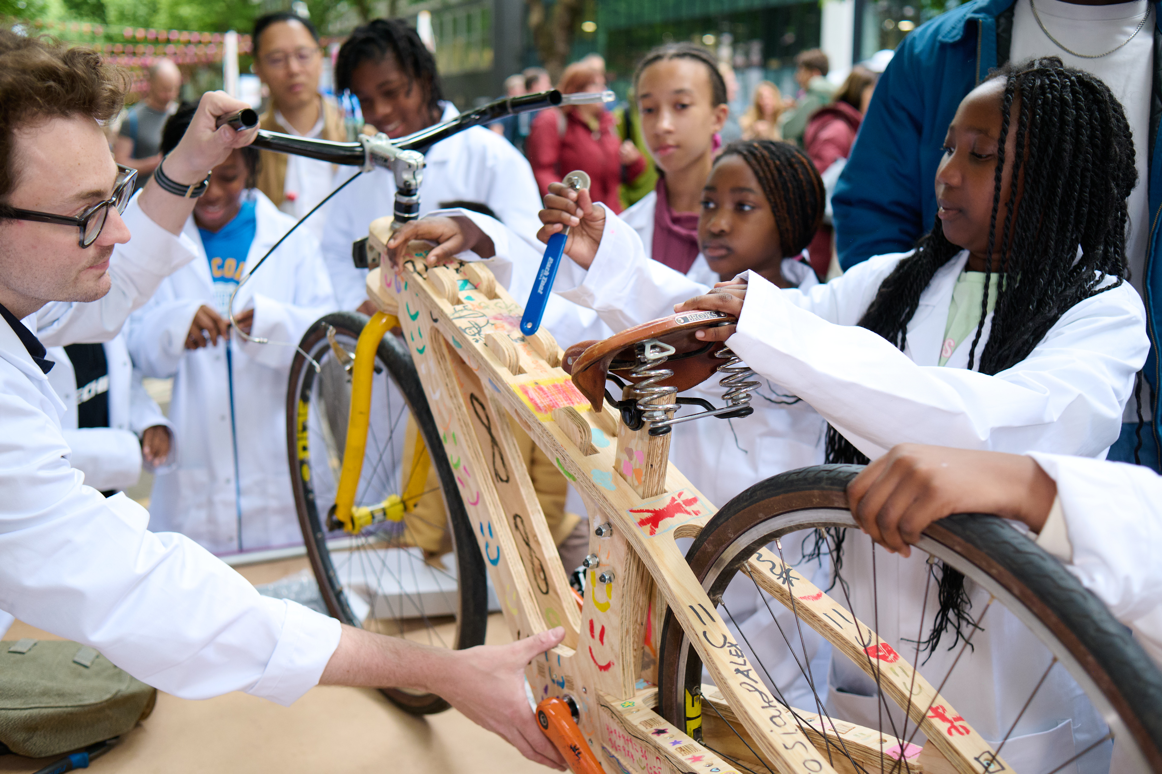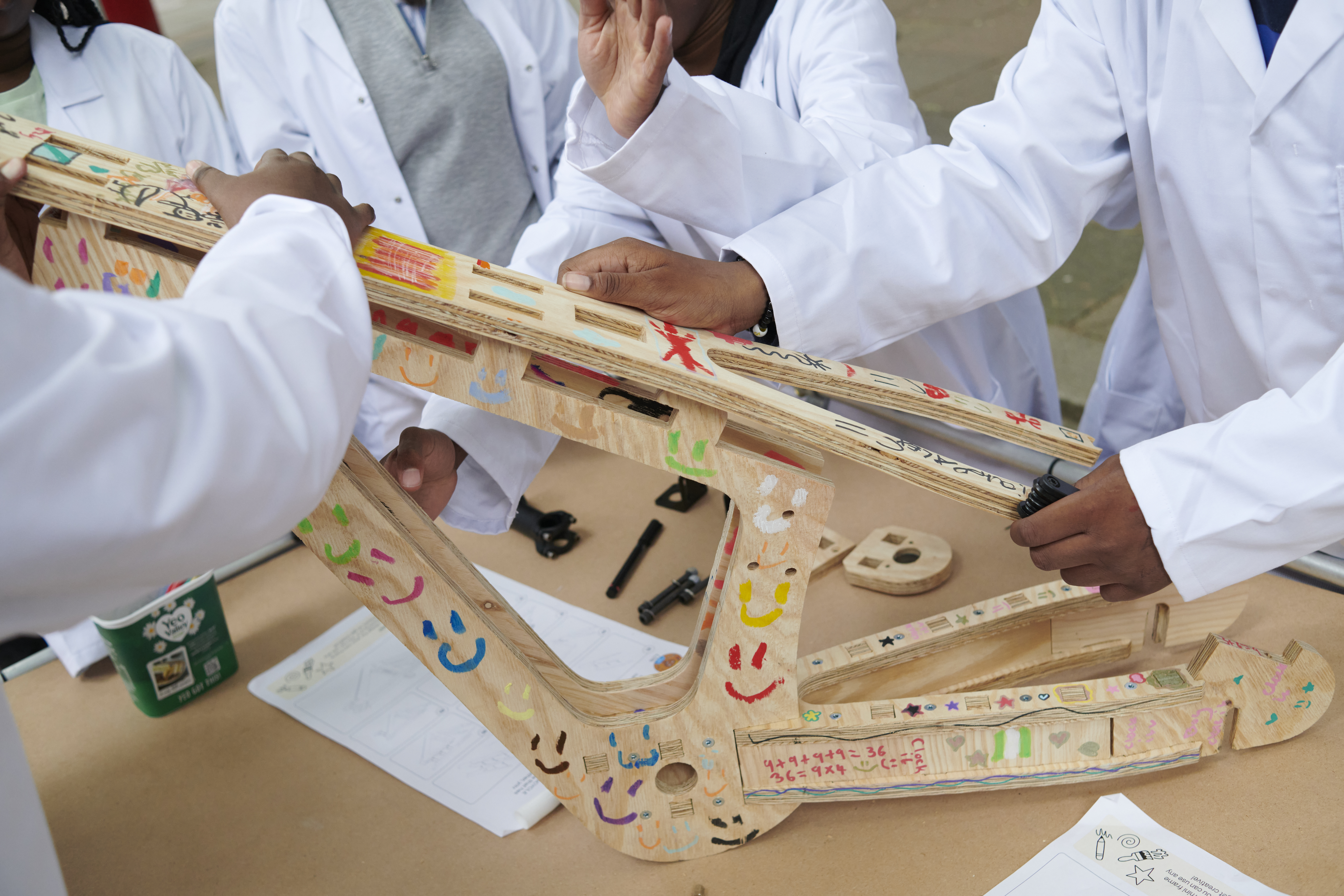 We started with mini builds and team discussions about “what makes a great bike,” before moving into lab coats and safety gear to assemble a full-scale wooden frame.