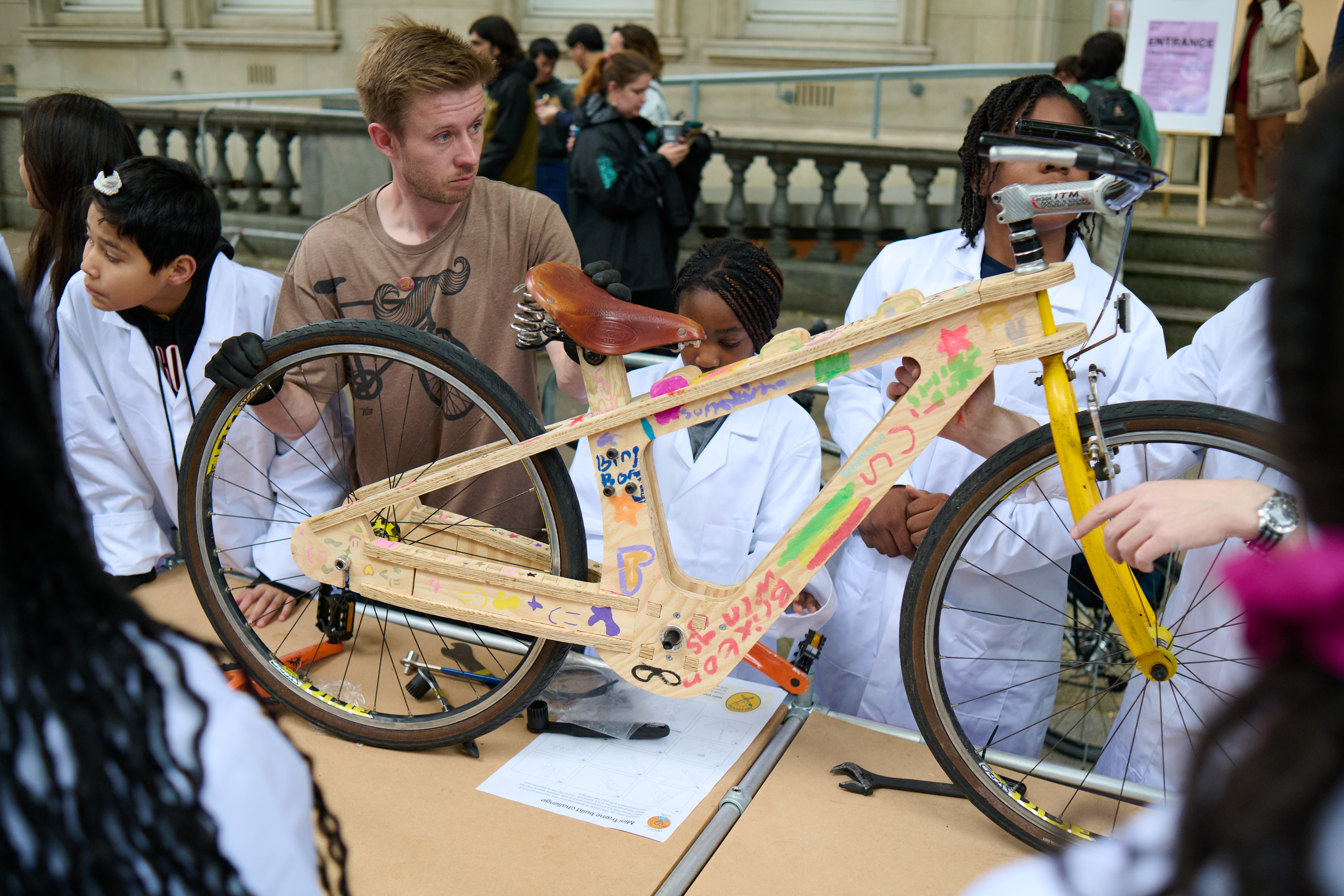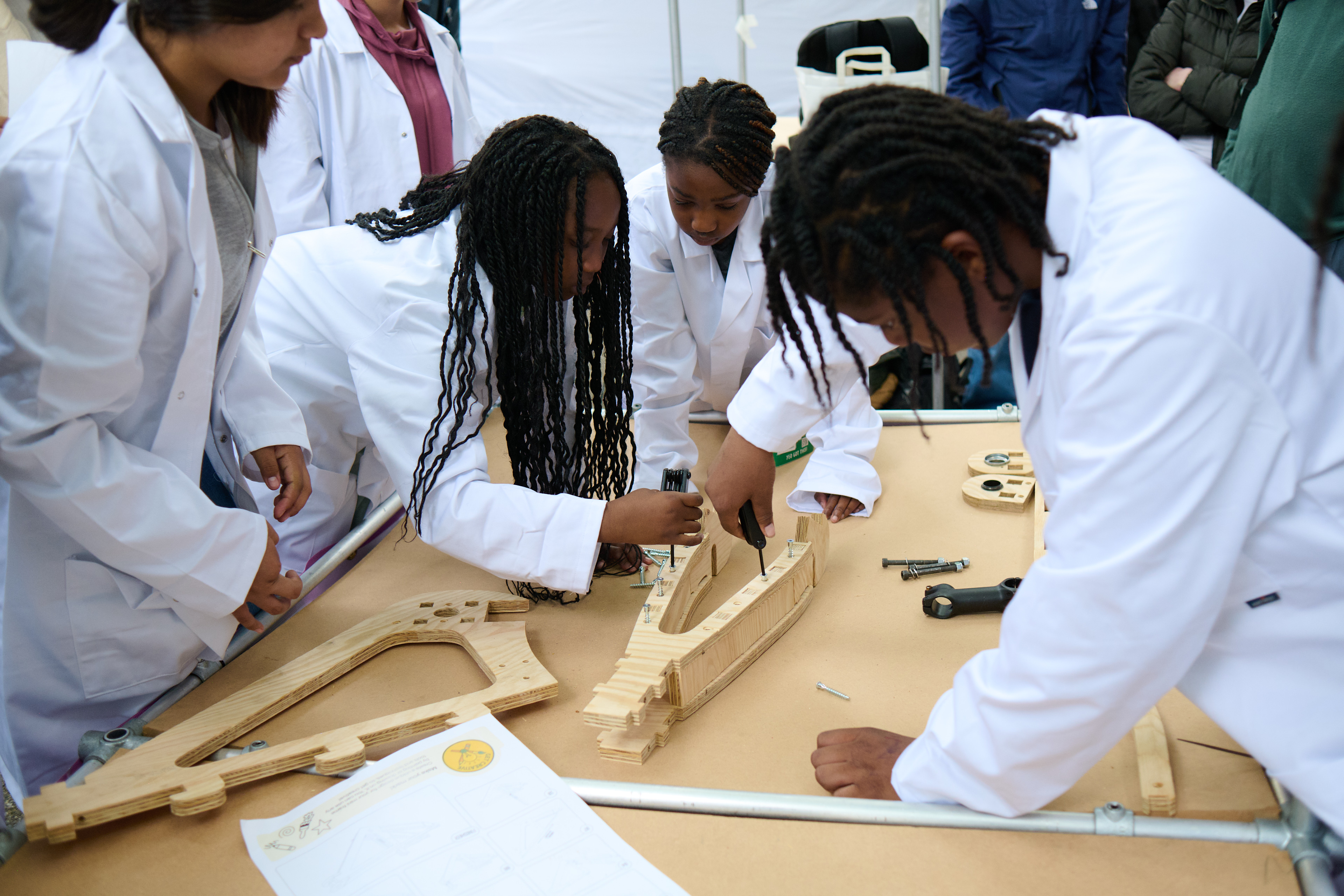 Across sessions at Evelyn Grace Academy, the Great Exhibition Road Festival, and Herne Hill Velodrome, participants built mini models, assembled a full-size wooden bike, and explored STEM concepts inside real makerspaces. The project strengthened confidence, teamwork, and creative problem-solving and the finished bike was later exhibited at the London Design Festival.